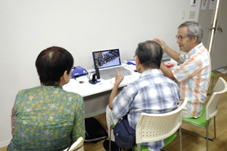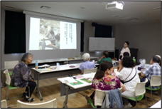 総会の後は簡単にお茶会を。スタッフ持ち寄りのお菓子と麦茶が配られて、思い思いにおしゃべりを楽しみます。正面のスクリーンには、こあじろの森くらぶ10年の歩みをまとめたプレゼンテーションが自動でくるくると動いています。画面を見る人、画面の説明を始めちゃう人、おしゃべりの合間にチラ見する予定のスクリーンが思いの外の大好評です。