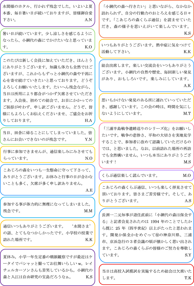 会員の皆々さま、スタッフの皆さま。今年もご支援ご協力によりまして、第10回の総会を無事に迎えることができました。ありがとうございました。どうぞ本年も、こあじろの森くらぶの行動や活動へ参加して、くらぶ活動をご一緒にたのしまれることをお勧めします。