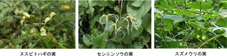 木 イヌザンショウの実、クサギの花と実、ゴンズイの実、コバノガマズミの実、タラの花(白い小花房のよう)、マユミの実、ハリギリの花、クコの花(つぼみ)、クリの殻(イガイガ)、サルトリイバラの実(まだ緑色)、ジャケツイバラの実(大きな枝豆)、フジの実