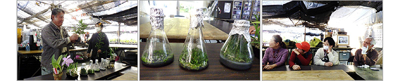 稲嶺さんは種のさやを2つつけた蘭の株と育成中で滅菌フラスコに入った4段階の成長過程がみられる見本とフラスコから出し栽培中の蘭の苗、花を咲かせた5年後の成熟蘭の姿を用意してくださり、段階毎に丁寧に静かに説明して下さいました。以下、簡単にお話をまとめて列記する。