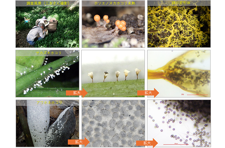 5月28日:忘れ物を取りにいったついでに3名で。黄色い変形体採取。持ち帰り、オートミールや麩、キノコ数種で誘いをかけても腐木から這い出してきてくれず、消えていってしまいました。別府さんもそのほかに、メダカの餌、熱帯魚の餌、イースト菌を試したものの、何も食べなかったそうです。時期が悪かったのか、好き嫌いがあるのか。綺麗なオレンジ色の未熟体は、その後別府さんの観察でホソエノヌカホコリに。