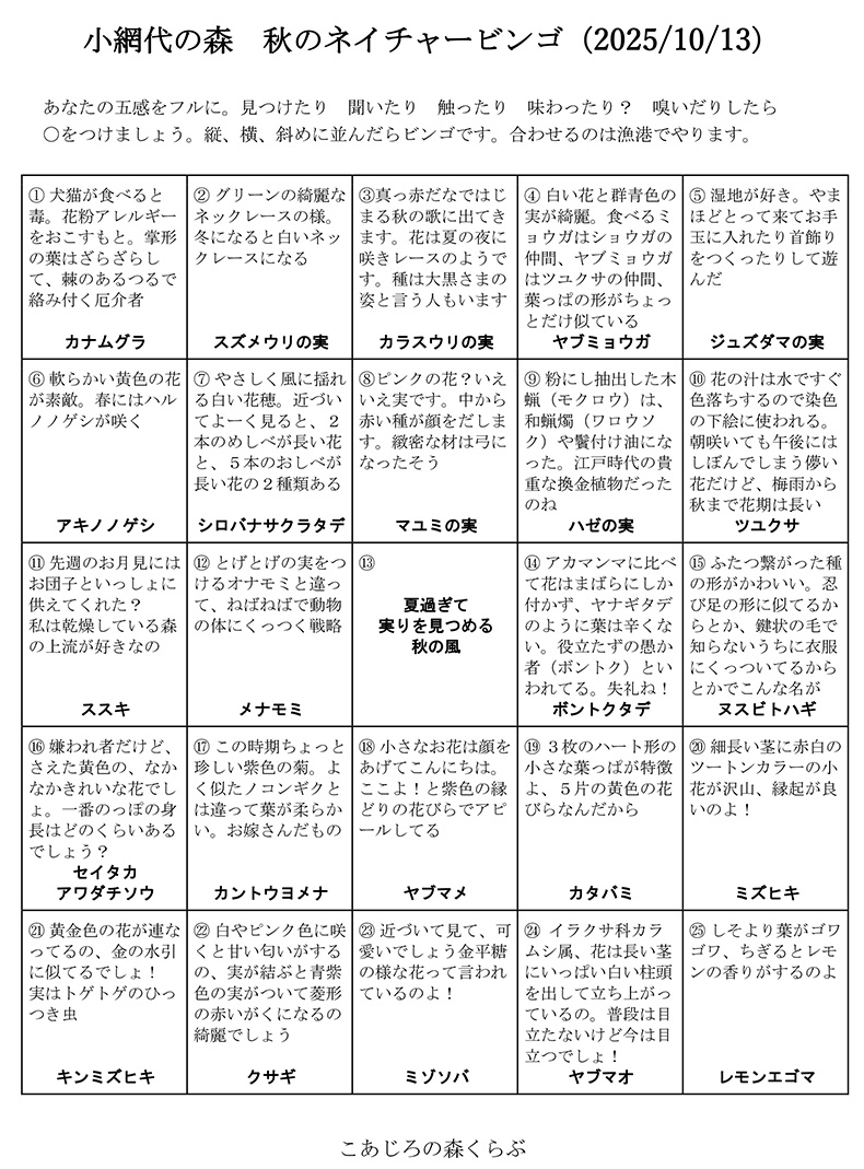 | 2025.10.13(月・祝) | 第49回交流会 「秋の植物ビンゴ」 | |
