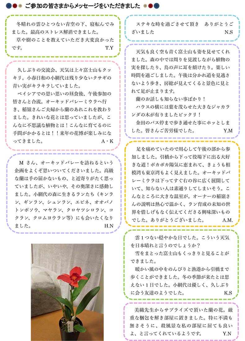 綺麗な蘭の花を咲かせるまでの苦労とかかった時間、そこに対応する稲嶺さんのご一家、一筋に蘭を追い続ける姿勢に感銘をうけた参観者の私たちは今度から蘭の花を唯単に綺麗だとだけ見ないと思う。その奥深さを、生産者への畏敬の念を込めて。最後にここで購入した蘭に困ったら相談してね。と渡された名刺にこの道に取り組んできた稲嶺夫妻の自信を感じてなぜかほっとした筆者なのだ。
